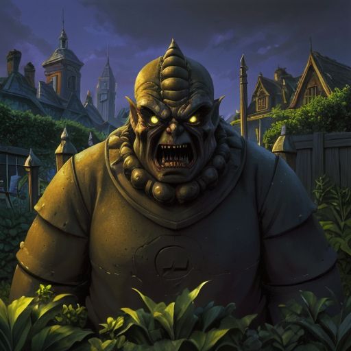 timjacobus, clay golem, evil, portrait, focus on face, cartoon, horror theme, garden in background, <lora:Tim_Jacobus_Style_Goosebumps:1>