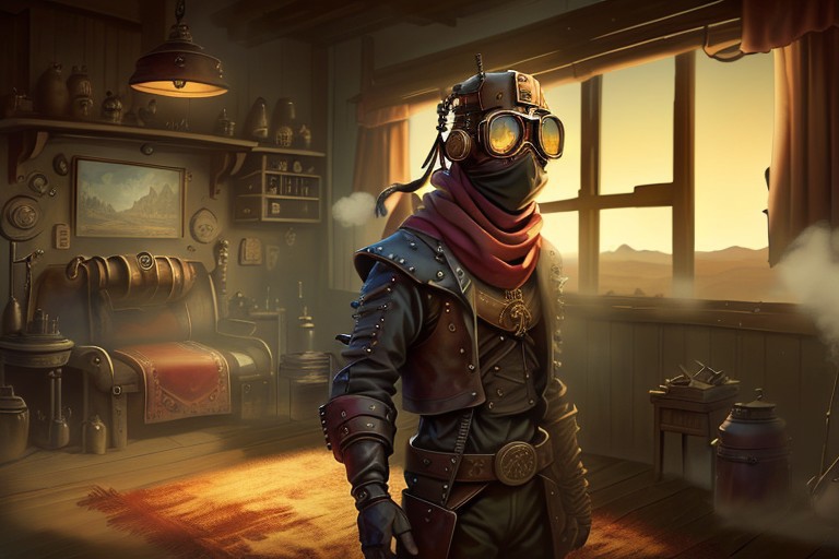 Wild West \(style\) photograph of beautiful, thin 18 years old, homemade leather skullcap, Homemade leather armer with stitching showing, red bandana covering her face, large steampunk goggles, hotel room, window view of desert landscape, Thornton-Pickard Imperial Triple Extension, f/6.3, patchwork leather armor, yhn, downblouse, nipslip, photo in phst artstyle, NEG-fixl-2, novuschroma37 style