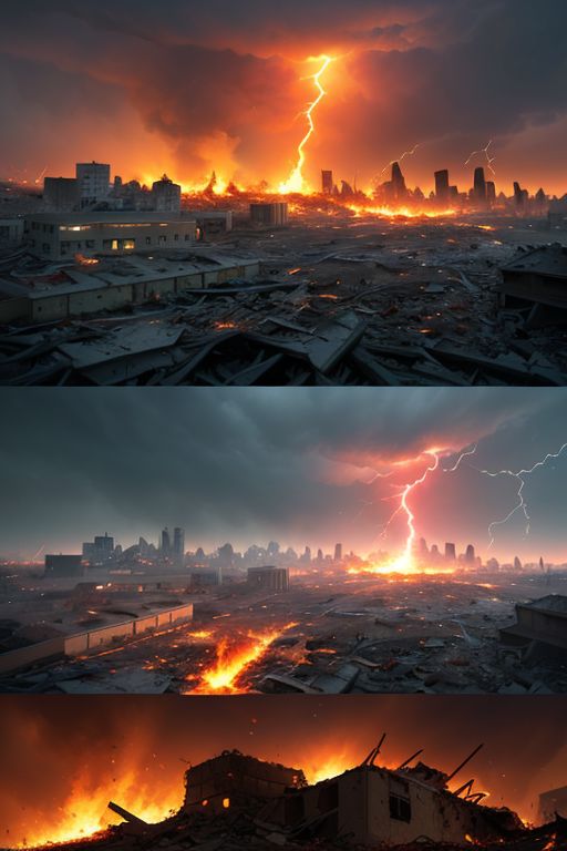<lora:ChaosEngine-v1:0.4> a burning city, layers of buildings and (red fire lightnings raining down and rubble set on fire), view from below, (suspended above ground), ultra realistic, 4k textures, dutch angle, dolly zoom, lens flare, fire tornado