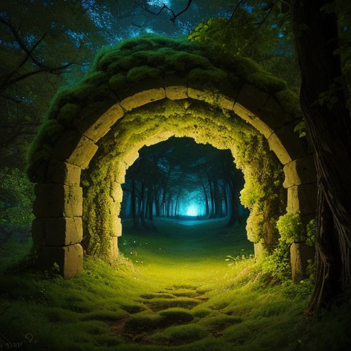 An ancient stone archway covered in bioluminescent moss that glows softly in various colors,