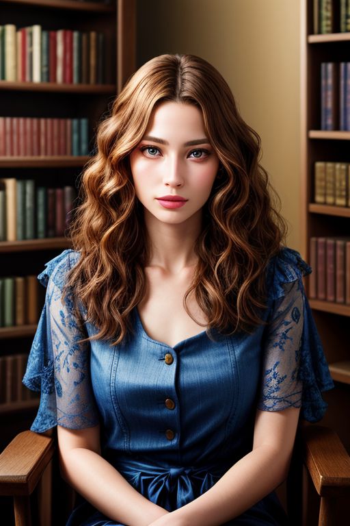 a woman sitting in a chair in front of a bookshelf, polaroid photo by leila faithfull, instagram, private press, studio portrait, studio lighting, full body, detailed facial features, beautiful detailed eyes, beautiful detailed lips, extremely detailed face and eyes, long eyelashes, elegant expression, natural lighting, warm color tones, soft background blur, high quality, 8k, masterpiece, photorealistic, professional portrait