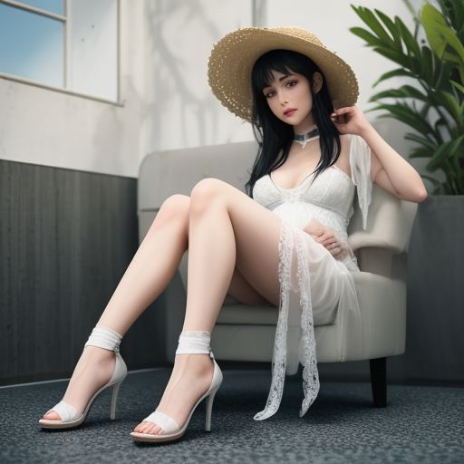 A pregnant woman with red pupils. Long straight black hair, with bangs covering her forehead. (Wearing: white straw hat tied with black silk scarf, white lace choker, white stockings, white high-heeled sandals.) Sit on a white chair and open your legs to both sides. Full-body photo.