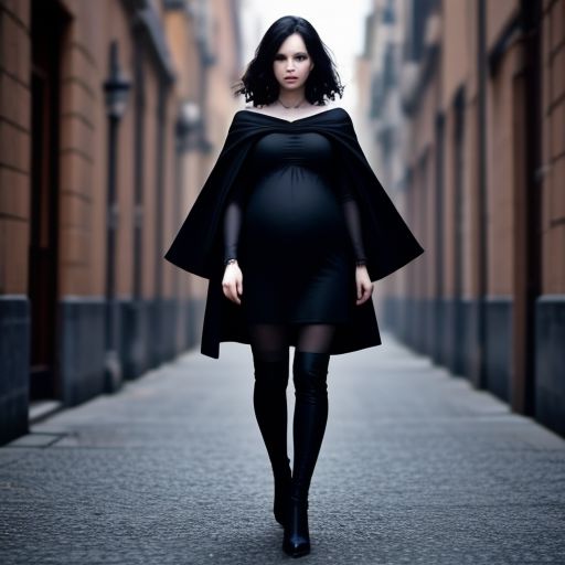 A pregnant woman with a pink shoulder-length bob and a lot of hair. Black gothic long-sleeved dress, black cape, black trousers, and black boots. Open legs in an M shape. Full-body photo.
