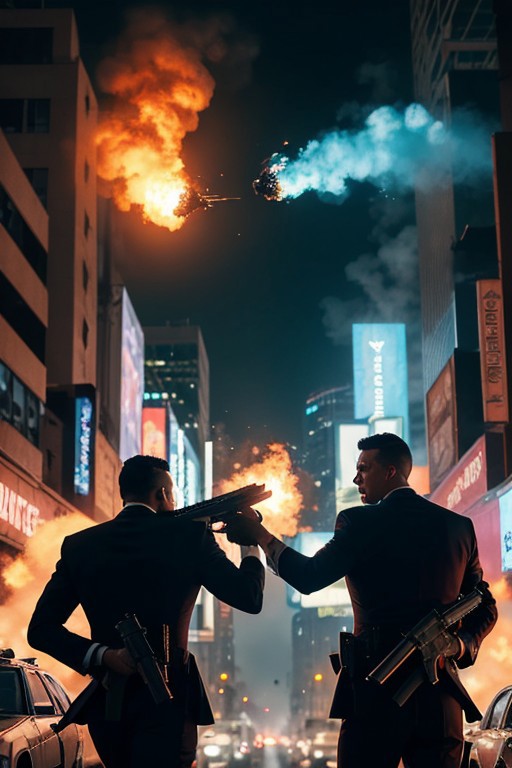 2 men, in gun fight, men in suit, men with guns, extreme gun fight, cinematic, climax, Michael bay movie, bright coloring, city background, hollywood, crime fight,