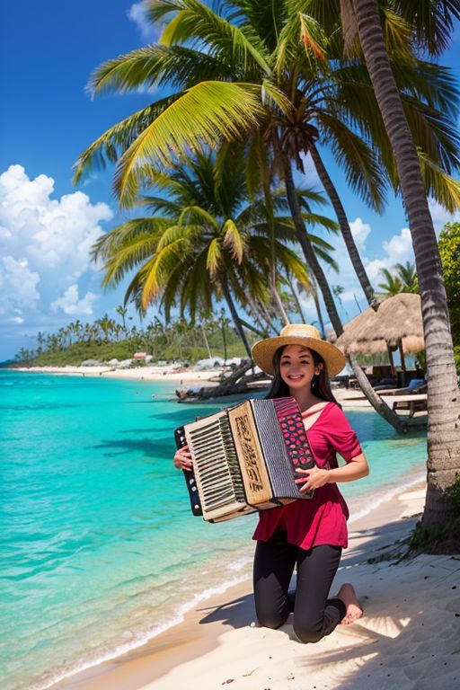 Accordion solo, resting on a pristine beach, turquoise waters, lush palm trees, tropical paradise, warm sunlight, Colombian cumbia vibes, hyper-realistic photo