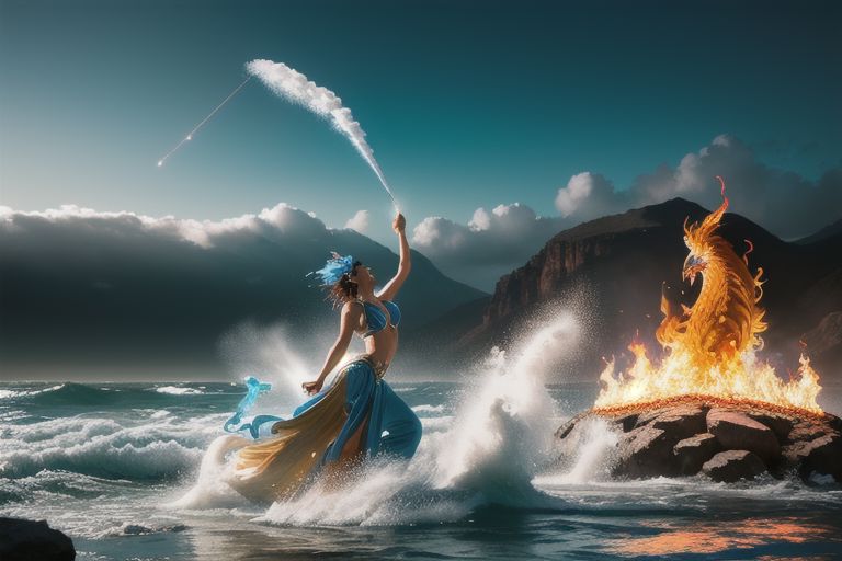 Title: Elemental Harmony Description: A captivating spectacle unfolds in this 8K UHD HDR masterpiece. Witness the dance of the four elements - fire, water, earth and air - intertwined in a cinematic perspective. The elements: ((with the correct anatomy)) Fire: (Fiery phoenix), whose graceful feathers burn, rises to the sky, symbolizing rebirth. Water: The Mighty (Neptune) emerges from the crashing waves, his detailed form embodying an endless flow. Earth: (a rocky giant) sculpted from earth, standing resolutely, with wisdom etched on his face. Air: breathtaking (sekasi woman) dances among the clouds, personifying freedom and inspiration. composition: The figures form a dynamic spiral, moving in sync, keeping their individuality.(The phoenix orbits Neptune), illuminating it. Neptune raises water, dousing the giant and the woman. The giant serves as the base of the dance while the woman floats above Visual Style: Cinematic lighting and contrasting colors emphasize the dynamics of the elements. The fire burns brightly, the water glistens coolly, the earth shows deep browns, and the air boasts soft whites and blues Optional details: Subtle landscape elements such as mountains, forests, rivers or clouds can enrich the scene. Symbolic elements representing balance (the cycle of life or unity) may be considered. General purpose: This award-winning photography captures the beauty and power of the elements in a harmonious dancece
