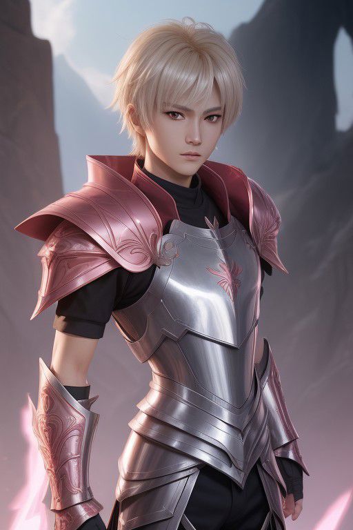GILGAMESH 1boy; portrait, anime fate style, ikki phoenix armor, <lora:Phoenix_Ikki:0.7>, ((from front)),(blue short sleeve shirt),Slender,1 boy in armor,8K,solo, (detail skin:1.2),best, (silver armor), (no helmet), pink armored boots, (clenched hand),pink armor, 1boy, solo, full body, red eyes, blond hair,