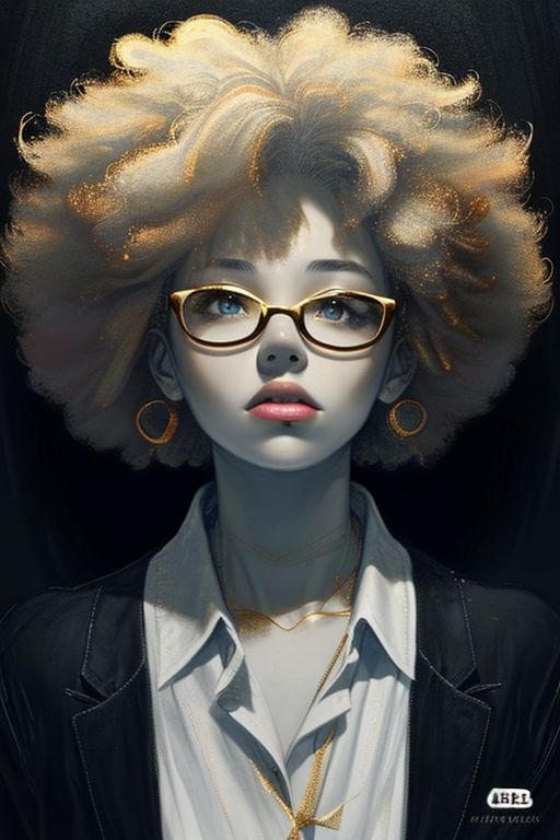 1girl, g0ld3mb, gold, portrait, wearing a black blazer white blouse, looking at the viewer, (((afro))), atsuko jackson, gray eye, cinematic lighting, hires, volumetric lighting, masterpiece, glasses, dark skin, taking off glasses