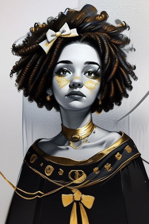 looking at the viewer, 1girl<lora:g0ld3mb:1> g0ld3mb, gold, portrait, (((black and white))), DoloresWaifu, (dress, skirt, traditional clothes), (afro, hair bow)