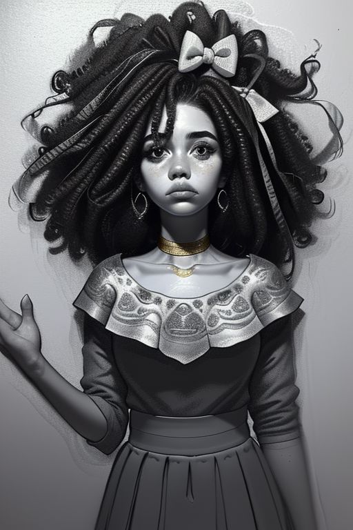 looking at the viewer, 1girl<lora:g0ld3mb:1> g0ld3mb, gold, portrait, (((black and white))), DoloresWaifu, (dress, skirt, traditional clothes), (afro, hair bow)