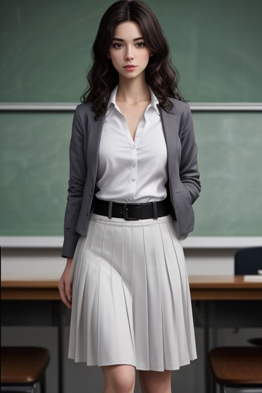 An girl with red long curly hair and no bangs. Wearing a white deep V-neck silk shirt, a black long-sleeved high school uniform jacket, a black pleated long skirt, and high-heeled sandals.in classroom.FHD, masterpiece, realistic style.