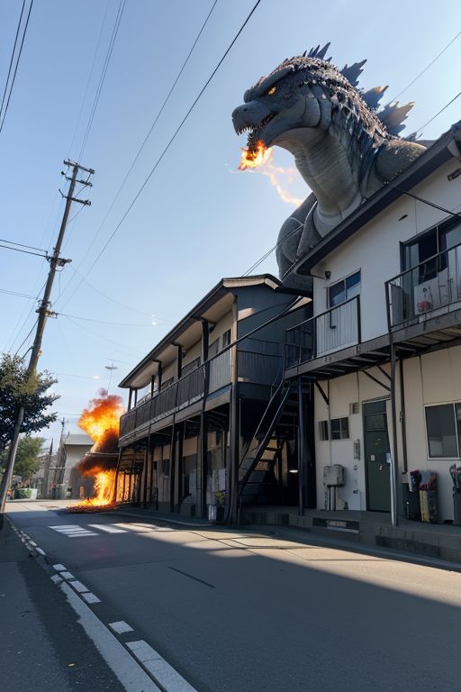 best quality, masterpiece,(solo:1.3), 1monster, gigantic godzilla,blowing fire,missile,extreme long shot bunkajutaku, scenery, power lines, building, utility pole, road, street, tree, window, house, sky, city, day, exterior, outdoors shadow, realistic,