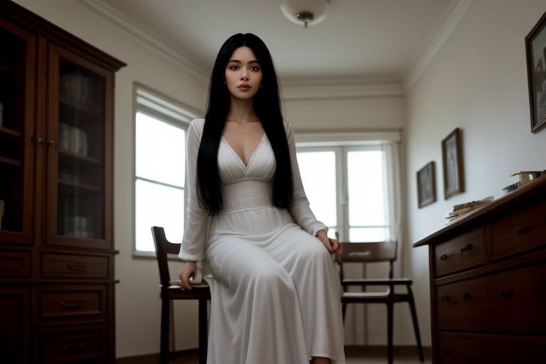 A female with long straight black hair and no bangs on her forehead. Wearing a white gothic deep V-neck long-sleeved dress. In a noble mansion, there is a large floor-to-ceiling picture window on the white wall. There is a horizontal white rectangular built-in low cabinet on the floor, which can also be used as a seat. She sat on the low cabinet, placed one leg flat on the low cabinet, and bent the other leg into an inverted V shape with her foot on the low cabinet. She looked up at the full moon and night view outside the window, and enjoyed the breeze blowing from the window. FHD, masterpiece, realistic style.