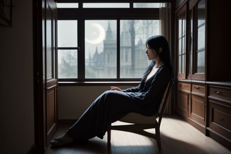 A female with long straight black hair and no bangs on her forehead. Wearing a white gothic deep V-neck long-sleeved dress. In a noble mansion, there is a large floor-to-ceiling picture window on the white wall. There is a horizontal white rectangular built-in low cabinet on the floor, which can also be used as a seat. She sat on the low cabinet, placed one leg flat on the low cabinet, and bent the other leg into an inverted V shape with her foot on the low cabinet. She looked up at the full moon and night view outside the window, and enjoyed the breeze blowing from the window. FHD, masterpiece, realistic style.