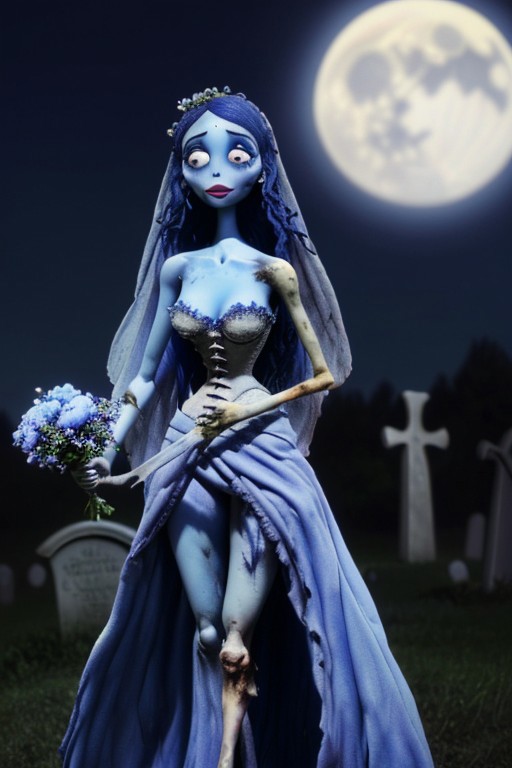 The Corpse Bride walking through a cemetery on a moonlit night. White full length dress, Light-blue skin, big eyes, big lips, tiny nose, blue mascara, blue hair, sultry, forlorn, looking at camera, holding dead bouquet of flowers