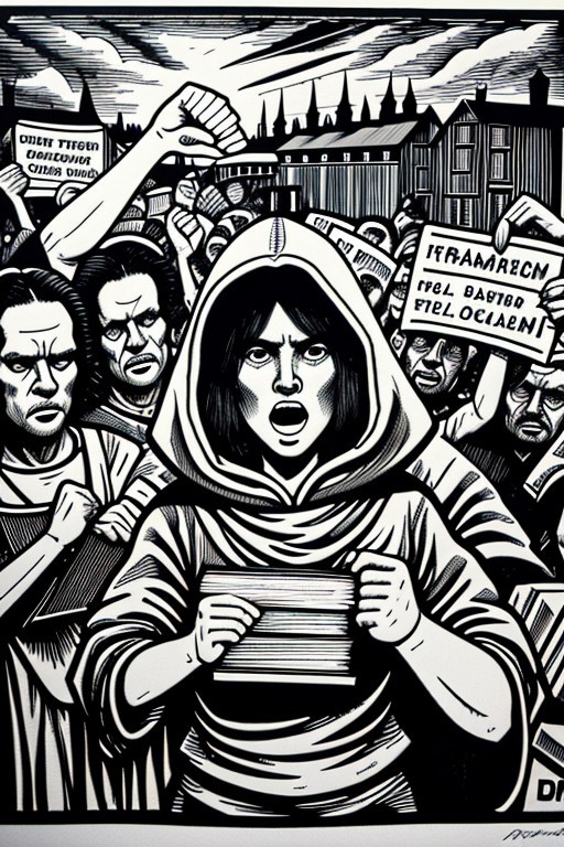 drckgrfk style block print, close-up, medieval monk wearing a hood protesting the rise of the printing press, fist raised, an angry mob holding up books, shouting, furious, <lora:dreamlookai_stable-diffusion-v1-5_step_2200_b53ad249_lora [drckgrfk style]:1>, high contrast