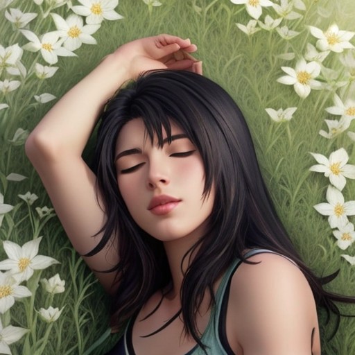 Rinoa, lying in a flower patch, on the ground, hands above head, eyes closed, white flowers, extremely detailed, beautiful girl, detailed anime, realistic anime