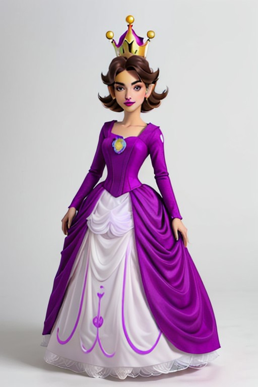 gender transformation, mtf, sequence, full body, simple background, standing, super crown, Waluigi, Waluette, princess dress, purple clothes with yellow highlights, long hair, pretty face, detailed face, detailed figure, Makeup, feminine features, dark brown hair, photorealistic, feminine face, subtle makeup, tall and lanky figure, long limbs,