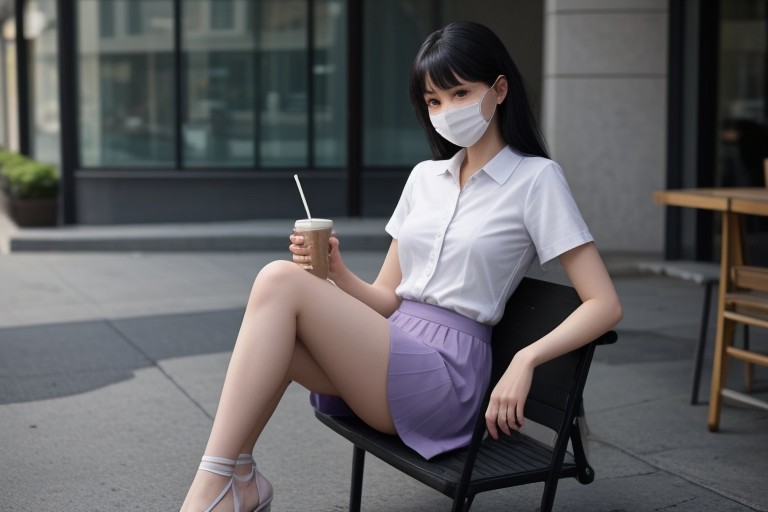 A female with long straight black hair and bangs on the right forehead. Wear a white mask, a white short-sleeved silk shirt with light purple spots, a bow with a white ribbon with light purple spots on the collar, a light purple skirt, and black high-heeled sandals. She was sitting on an outdoor seat outside a Starbucks store, with a large cup of Starbucks coffee on the table. FHD, masterpiece, realistic style.