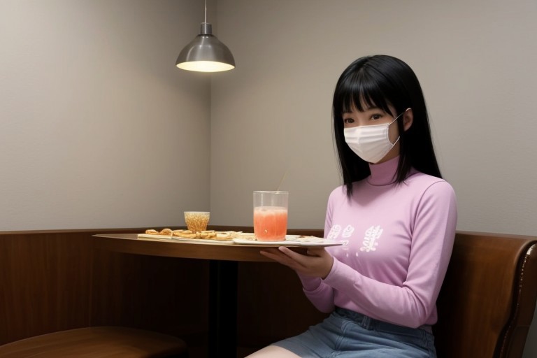 A young Asian woman with long straight black hair and bangs on her forehead. Wearing a white mask, a pink turtleneck short-sleeved T-shirt with a light purple cat face pattern, and a light purple collar and cuffs. She was sitting on a seat in the waffle shop. On the table was a plate of fruit waffles piled high, topped with syrup and cream, and a large glass of pink juice. There are slices of various fruits, and thick straws are stuck on the cups. FHD, masterpiece, realistic style.