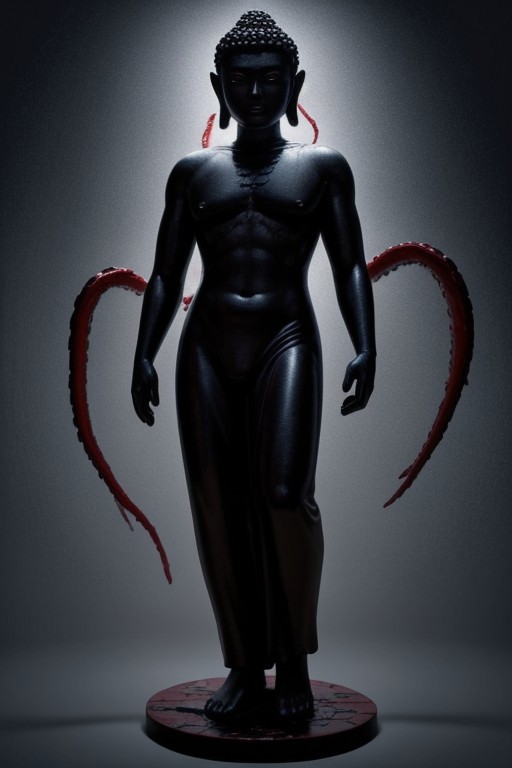 Something that cannot be described: Late at night, there is a huge golden Buddha statue with only the right half of its body, and the left half of its body is a huge pitch-black figure with many pitch-black tentacles extending from it. The figure's eyes glowed red. FHD, masterpiece, realistic style.