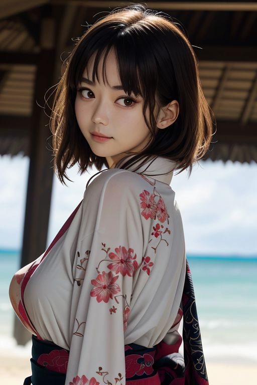 gorgeous lips, cinematic, (masterpiece), (best quality), (ultra-detailed), very aesthetic, illustration, perfect composition, intricate details, absurdres, detailed face, (anime, masterpiece, intricate:1.3), (best quality, hires textures, high detail:1.2), (4k),(incredibly detailed:1.4) (beautiful detailed face, beautiful detailed eyes) villain, 1woman, arrogant smile high pointed nose, (nostrils:1.3), patterned bra, blurry, no bra, 22-year-old woman, pale skin, black eyes, onyx brown long hair, big brests red yukata, from in front of, outdoors, standing on a beach, dimly lit, A raised eyebrow and a slight tilt of the head, showing interest and inquisitiveness. and holding a katana