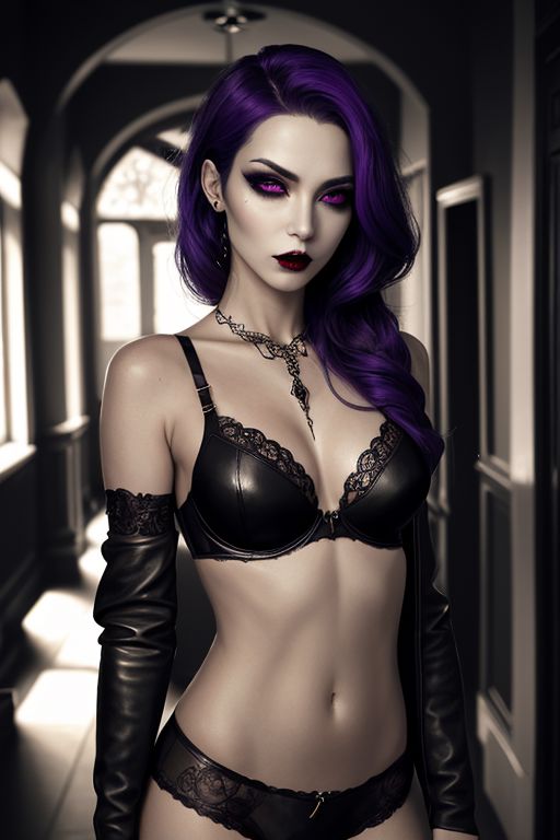 glamour photography of a beautiful vampire goth girl, edgy vibe, dark, mascara, eyeliner, dark purple details, ornate jewelry, smoky eye makeup, full narrow lips, narrow face, skin pores, smooth skin, leather bra, faint lighting, sepia tone, dark stone corridor in background