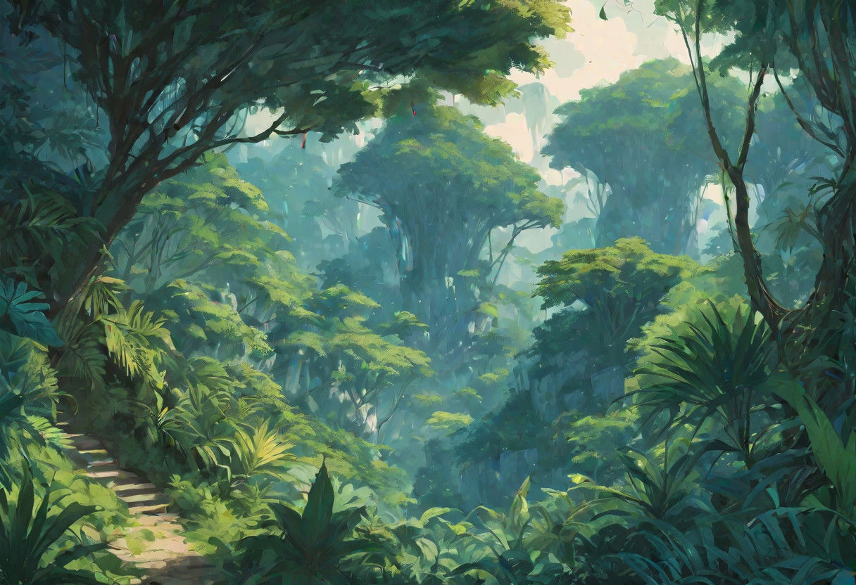 a jungle full of lush, green plants, such as bushes and grasses. It also has blue plants, along with large trees resembling umbrellas and deep cliffsides everywhere.