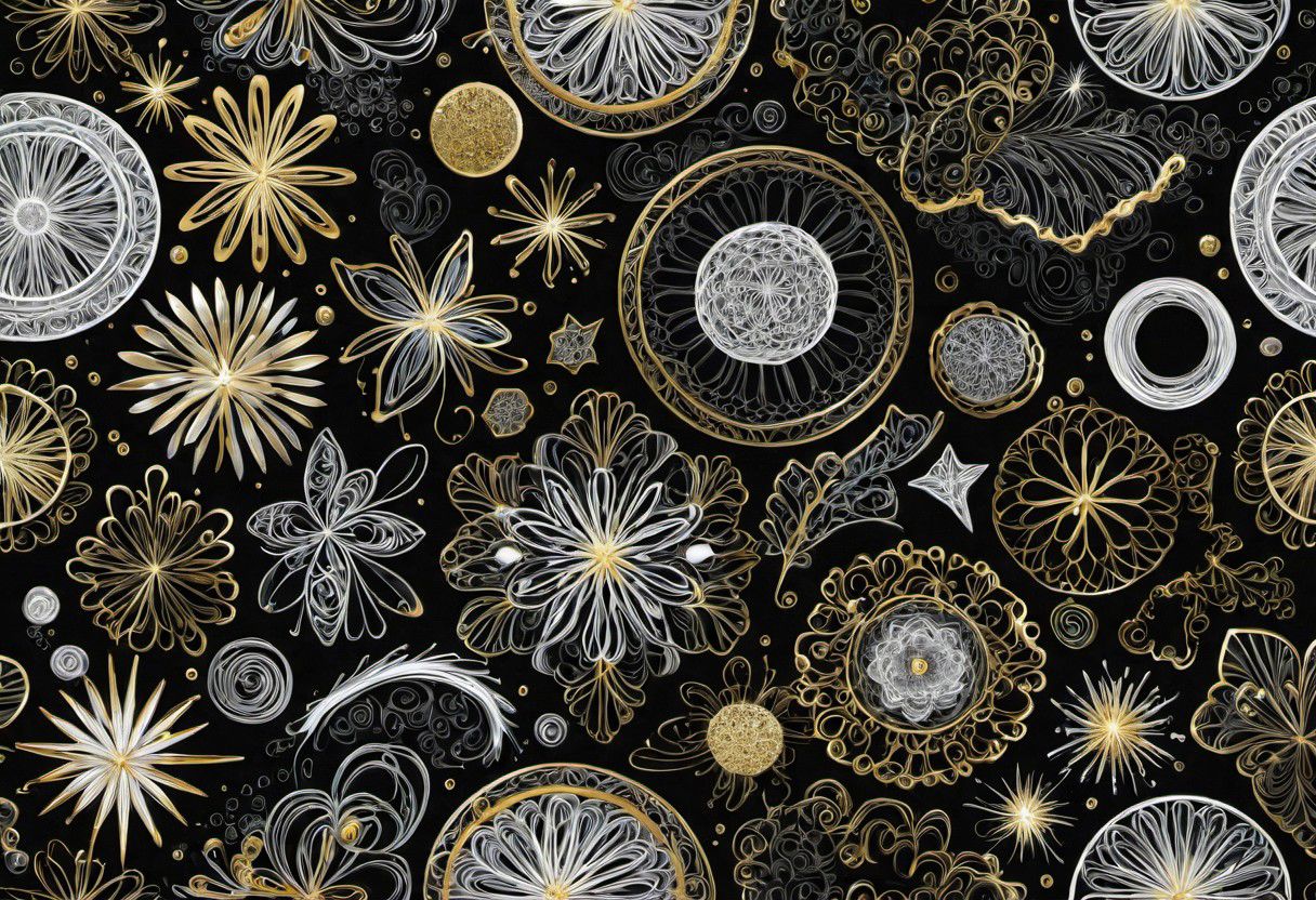 detailed 2D white+gold doodles on black background, crisp edges, merged with a 3D rendition of gassy or bubbly soft-edged shapes in many colors,