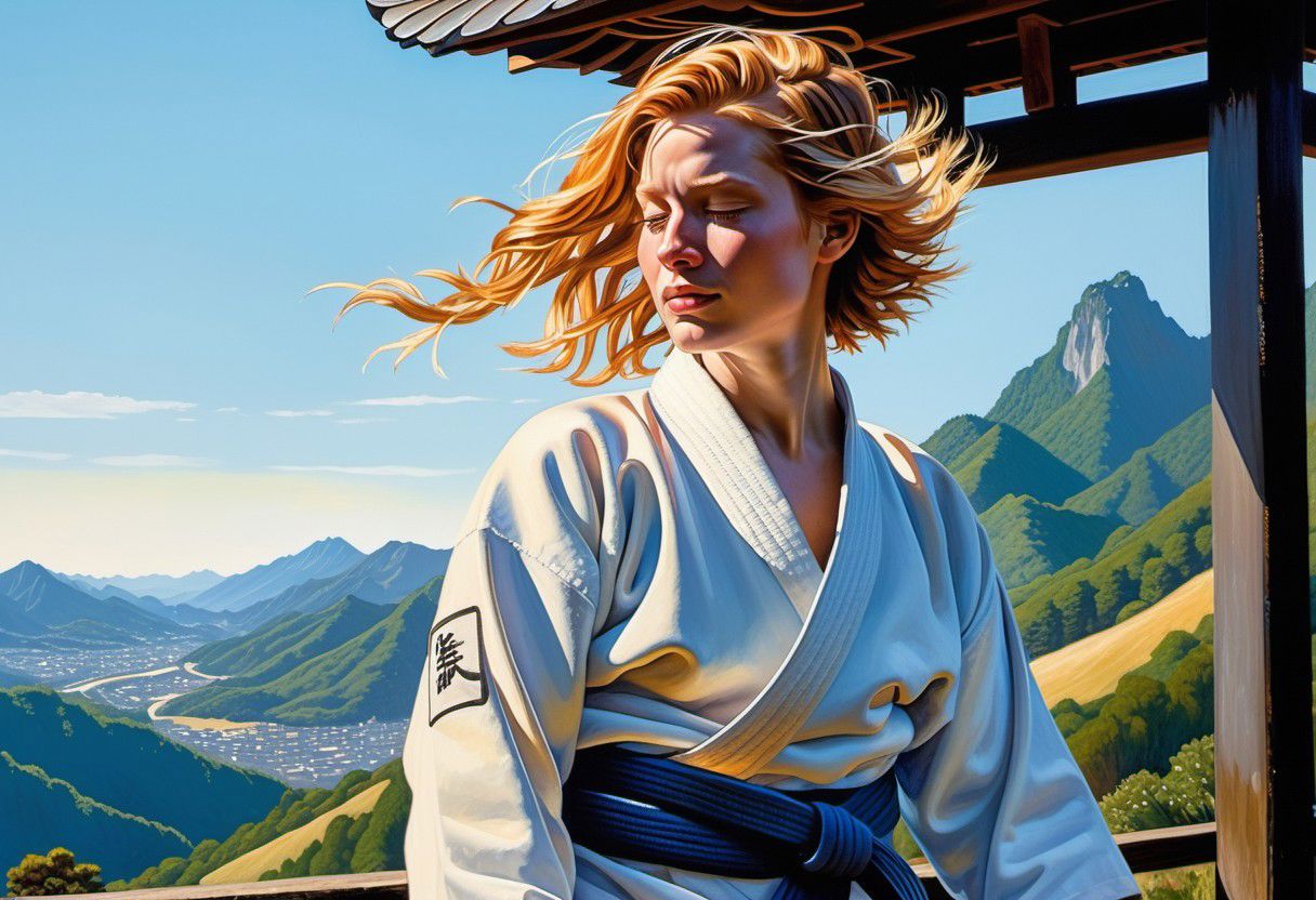 thick-stroke Oil Painting. ((detailed)), Turning view of (short, stocky girl). (pretty girl), alone on hill-top shrine, Japanese scenery, small pagoda, (poised), twinkling eyes, exhausted smile, sweaty skin)), ((dimples)). clavicles. upturned cone-shaped breasts, Navel. ((Disheveled top)), ((wide-open high-quality thick white judo top hanging freely loose)). ((Textured ginger-blonde part-braided Side-Swept Bob-cut hair)), wearing long white Judo pants, (detailed nipples), (((carrying unworn Judo belt))), tiny full-moon rising just over dark horizon, (((appropriate shadowing))), ((appropriate direction of sunlight)), Very Dark background. ((golden hour lighting from front)),