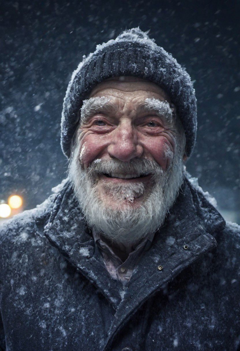 epiCNegative, JuggernautNegative, full body shot of smiling old man with frozen skin at winter night, snow storm, frost on eyebrows, eyelashes and beard, hyper realism, lights boke