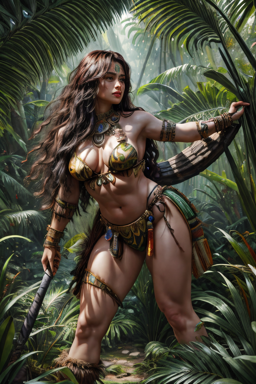 Ultra-realistic 8k CG, masterpiece, best quality, ((very detailed face)),masterpiece, best quality, 1girl, colorful, full body, wide shot, jungle background, <lora:more_details:0.8> <lora:Barbarian_woman:0.8> barbarian_woman