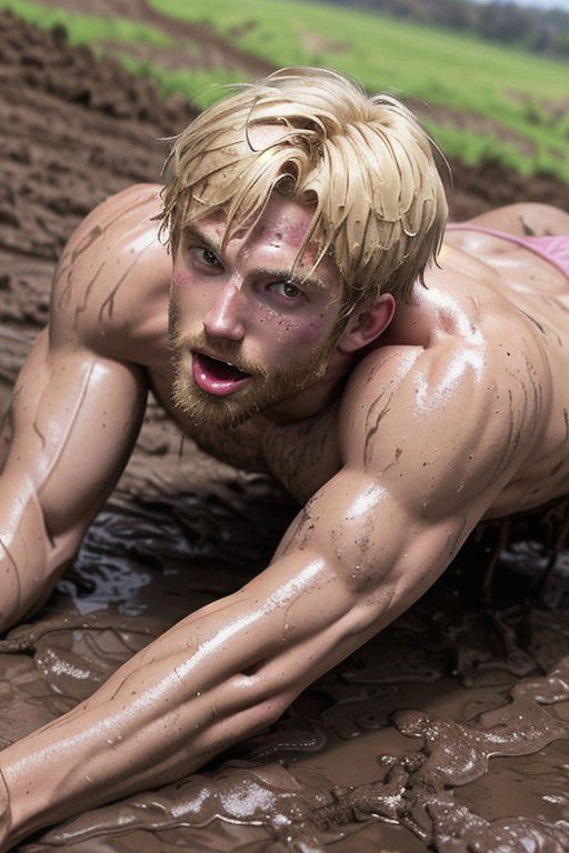 clearpicture, goodquality, bara, furry, (looking at viewers), (on the floor), 1man, blond hair man, topless, pig's ears, wearing pink thong, covered by mud, face covered by mud, mud bg, mud background, farm bg, wide open mouth, tongue out