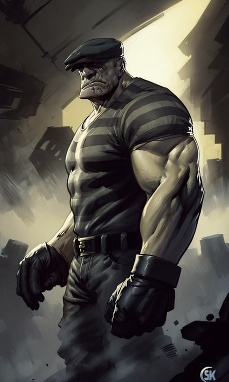 thegoon2023, 1 large man, flat cap, muscular, scar, 8k, uhd, trending on arstation, award winning art, best quality, masterpiece, noir, dramatic lighting, comic, gloves, illustration, EricPowell2023