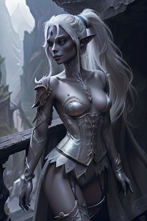 (masterpiece:1.5), (Highly detailed scenery:1.5), (perfect detail:1.5), (highly detailed:1.5), (high resolution:1.5), (fantasy:1.2), solo, a young woman, (((dark-grey skin))), dark elf, ((drow)), long hair, pointy ears, perfect body, petite, very cute, cowboy shot, nude, pussy, ((cameltoe)), white-silver pubic hair, trim pubic hair, ((not panties)), fantasy, magical, fit body, flat chest, sexy, clit pussy, single clitoris, <lora:m99_labiaplasty_pussy_2:0.4>, (((from_below ))), [crotch apart], ((thigs gap)), gorget, thigs armor, leg armor, gloves, [transparent loincloth], 1girl in full growth, (white-silver hair), (ponytail:1.3), cowboy shot, nude, (topless), [no panties], medium breasts, corset armor, outdoors, elven city in a dark cave on background, drow city in a cave, dark fantasy,