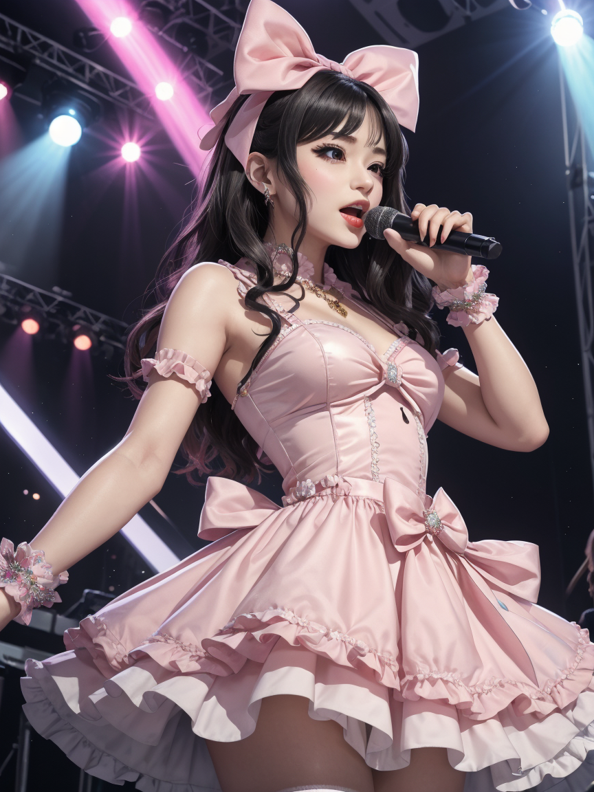 solo, beautiful girl, idol dress, singing, stage lights, bows, ribbon, jewelry <lora:idol_dress-1.0:0.8>