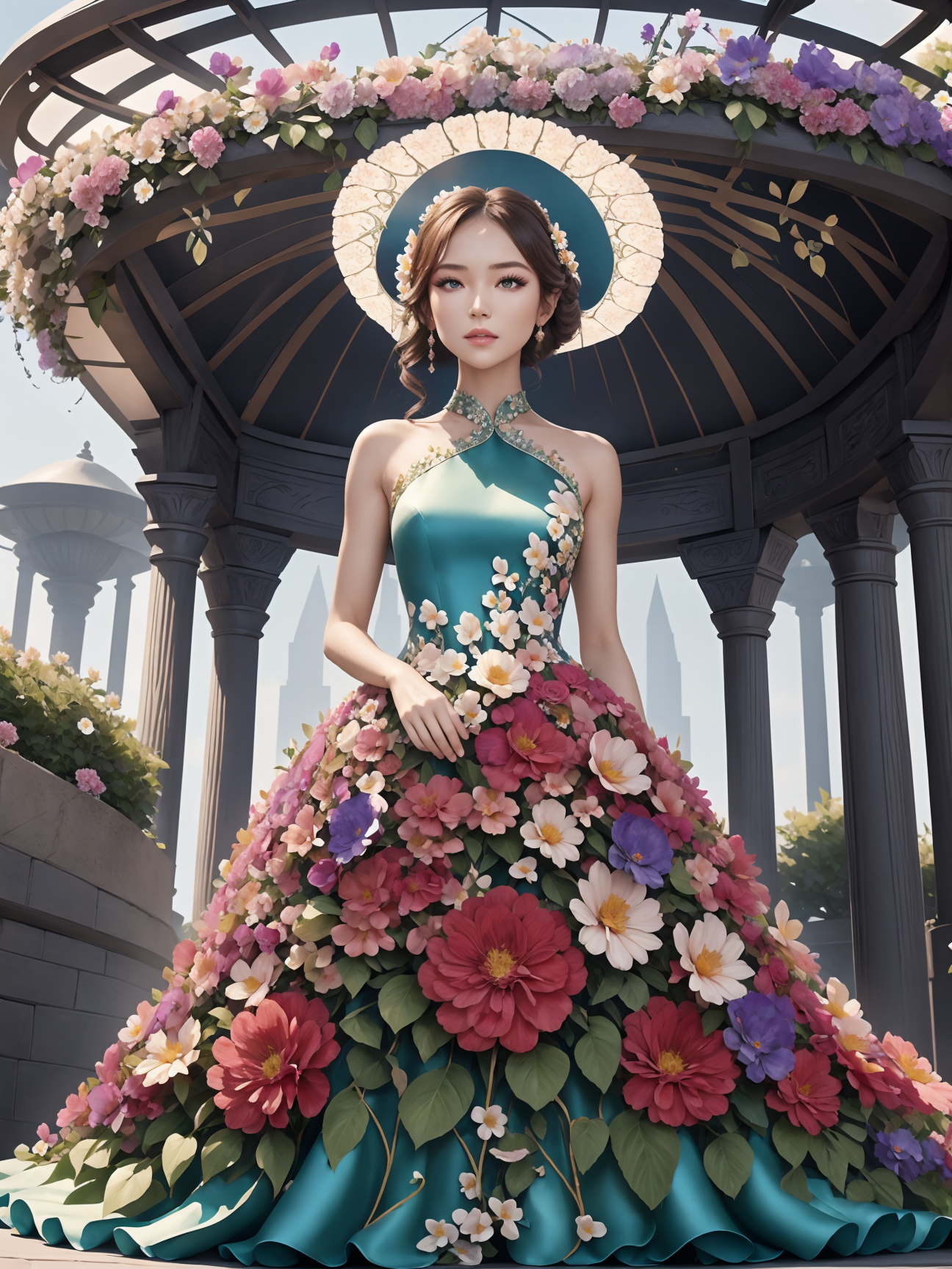 breathtaking 8k, masterpiece, beautiful girl, flower dress, <lora:flower_dress-1.0:0.8>, gazebo, outdoors . award-winning, professional, highly detailed