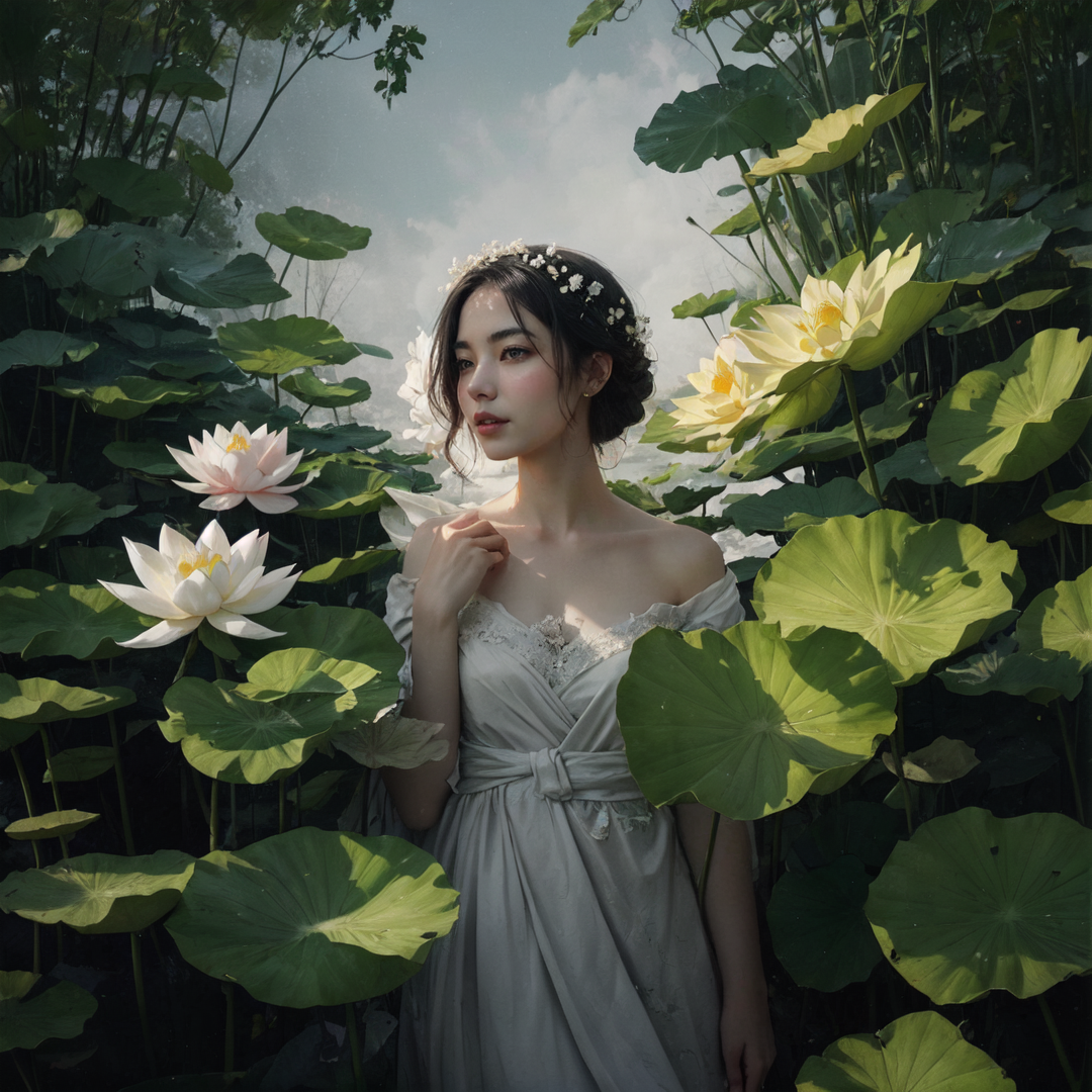 a The girl was surrounded by huge lotus,1girl,masterpiece,official art,unity 8k wallpaper,ultra detailed,beautiful and aesthetic,best quality,intricate details,\\nofficial art,unity 8k wallpaper,ultra detailed,beautiful and aesthetic,beautiful,masterpiece,best quality,portrait of the most beautiful form of chaos,elegant,a brutalist designed,vivid colours,romanticism,atmospheric,a beautiful 30y old girl with white lotus,lotus,lush plants,limited color palette,extremely lush and colorful hair,full body,alluring pose, <lora:oujuV2:0.2>, <lora:DarkLighting:0.5>,spotlight, dark theme,floating hair