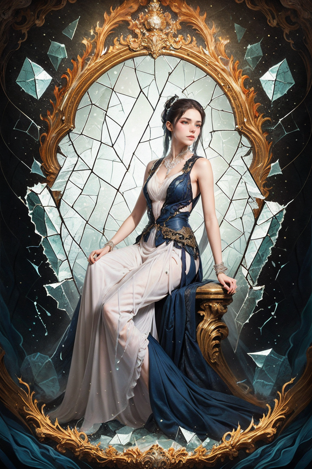 1girl,sitting_on_chair,elegant posture,(broken glass:1.3),mirror,elegant,intricate,highly detailed,(upper_body:1.2),digital photography,<lora:Lws mural_20231112215331:0.6>,