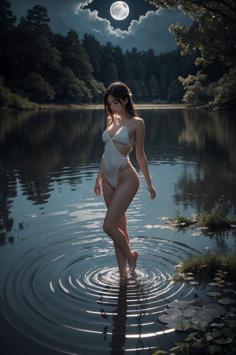 Stunning photo of a girl,etheral,dancing in shallow calm waters of a gloomy lake,partially submerged,large moon shining silvery moonlight,ripples in the water,serene and quiet night,shadows,soft luminescence,mystical atmossphere,captivating pose,free spirit,embodiment of lust,ultra realistic,masterpiece,best quality,highly detailed,muted colors,dynamic_angle,