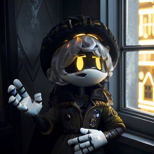 (8k uhd, masterpiece, best quality, high quality, ) 1boy, N, murder drone, android, robot hands, doll joints, brown fur lined coat, white hair, yellow eyes, headband, black coat, cap, hat, stand up, window, dark, eyes visible, eyes opened, ((happy, talking, hand over window)) <lora:Murder-DronesV2r:0.91>