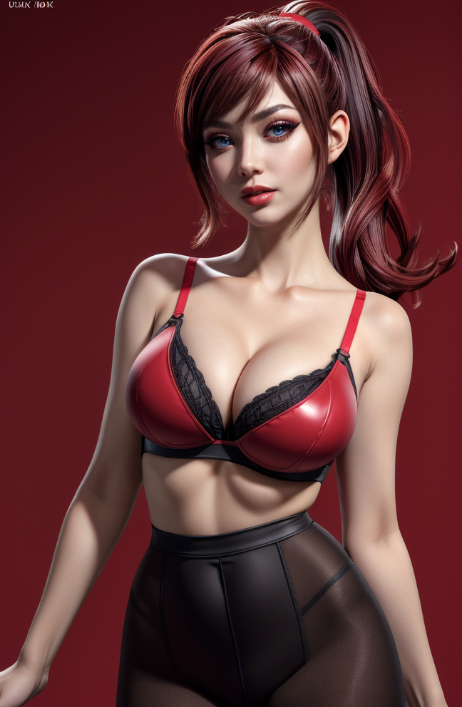 (3dmm style, illustration cover magazine, realistic, photo-realistic, amazing, finely detail, incredibly absurdres, ultra-detailed, highres, extremely detailed CG unity 8k wallpaper) <lora:Millie_Roberts:1>, petite woman,standing, pale skin, red bra, <lora:lora:0.5> glossy pantyhose, big breast, (black double ponytail hair), red background, vivid colors<lora:add_detail:0.99><lora:PerfectFullBreasts-fCV3.5:1> <lora:3DMM_V12:1>