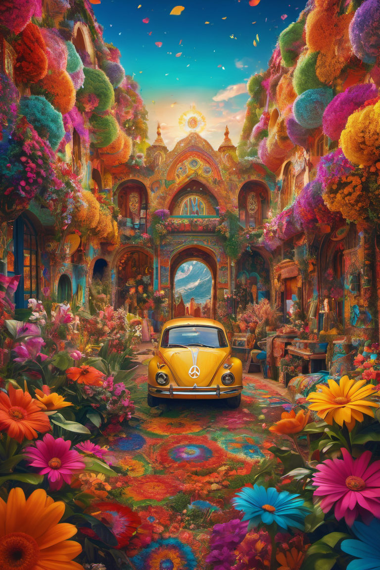 modelshoot style, (extremely detailed 8k wallpaper:1.10), a medium shot photo of a Magic realism, bohemian culture of the 1960s., curtness overload, flower power, peace signs, masterpiece, extremely detailed, complex composition, fantasy, wide angle, glowing, colorful painting, rich color, UHD octane render, digital illustration, Intricate, High Detail, dramatic
