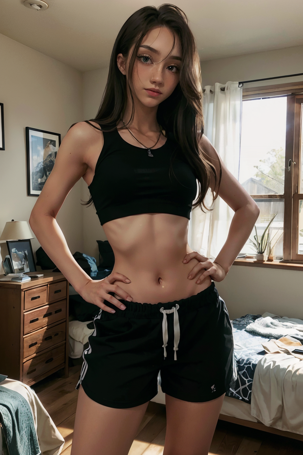 <lora:Fiona:.7>, long black hair, brown eyes, athletic, looking at viewer, serious,wearing casual clothing, midriff, shorts, standing, hands on hips, inside a cozy bedroom, window, natural lighting, extreme detail, masterpiece,