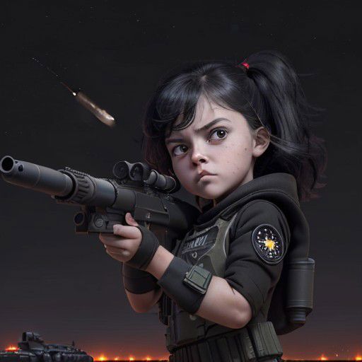 Masterpiece, best quality, Pixar cartoon style, a young girl, gun pointing, angry, ((heavily weaponised child aims at you)), (guns), ((2 rockets)), ((2 nuclear weapons)), (2 canons), armour plating, (2 big jets in the background), (((dark black sky))), small moon, 8k epic detail, brilliant photography, don t mess with me