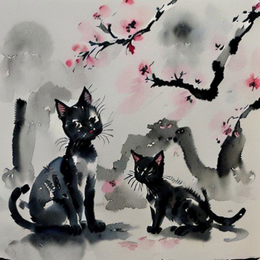 (1 black cat) sits beside (1 gray cat) nearby ((1 solid black kitten)) (1 cherry blossom tree) ink painting, ink drawing, no more than 4 colors, on aged paper background. watercolorstyle <lora:watercolorstyle:1.1>