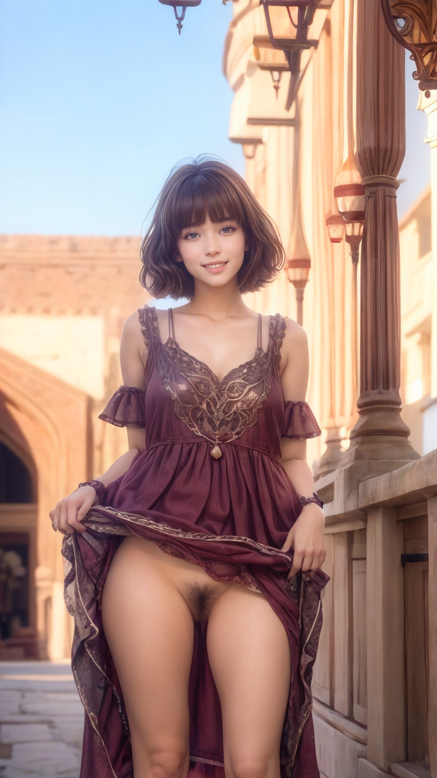 masterpiece,best quality,cinematic lighting,natural shadow,Low Angle, edgMeso,1girl,photo of a cute girl,full body,light smile,charming,20yo,wearing edgMeso clothing,afro hair.Blunt bangs,Bronze hair,Burgundy,Pleats,outdoors,skirtlift,hairy pussy,hairy pubes, <lora:edgMesopotamian_Fusion:1>, <lora:GoodHands-vanilla:1>, <lora:skirtlift-v4:0.8>,<lora:third:0.5>, <lora:add_detail:1>, <lora:æ³å :0.5>,