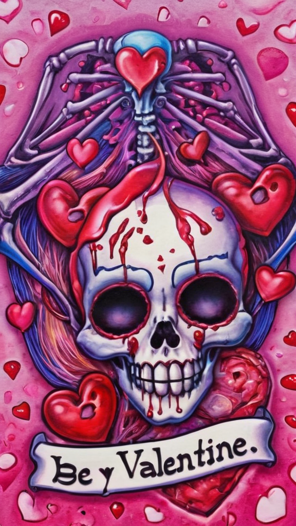 an artists interpretive depiction of a bloody valentine with the text ("BE MY VALENTINE":1.1), (japanese tattoo art style, new school tattoo art style:1.2), (a cute macabre adult valentine's day card:1.1), by (Lisa Frank:1.4), breathtaking, a hyperdetailed digital ink painting, high contrast, accentuated luminosity and intricate details surreal and majestic atmosphere, award-winning, professional, highly detailed, high quality, 8k, extremely detailed oil painting, multicolored, unreal 5 render, digital art, 8K artistic photography, octane render, beautiful composition, award-winning photograph, masterpiece, cute, skulls, skeletons, cartoon, love, hearts, BREAK (a cute macabre adult valentine's day card with the text "BE MY VALENTINE":1.3), ("BE MY VALENTINE":1.3) BREAK (by Lisa Frank:1.4)