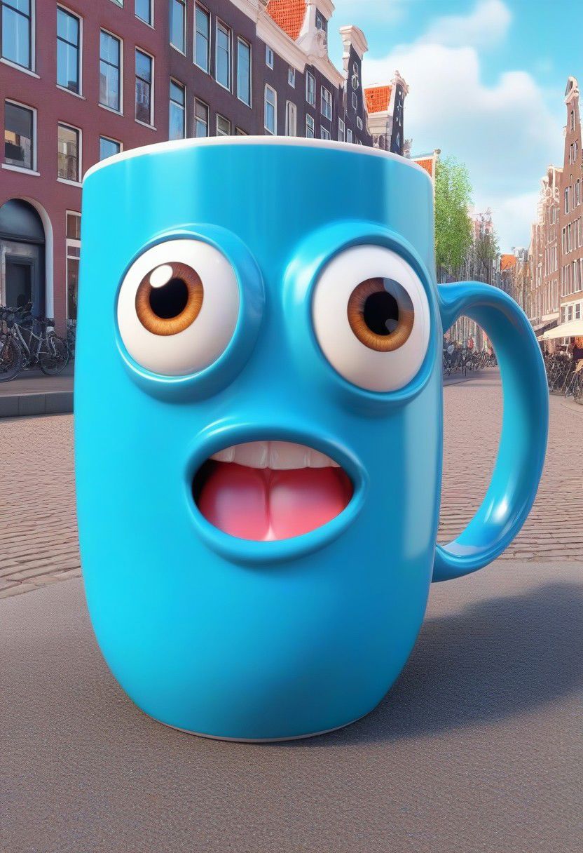humanoid coffee mug with 2 big expressive eyes, winks with one eye at viewer, human teeth, arms, cartoon hands, legs, cartoon feet, dancing through Amsterdam, 8k, high-resolution