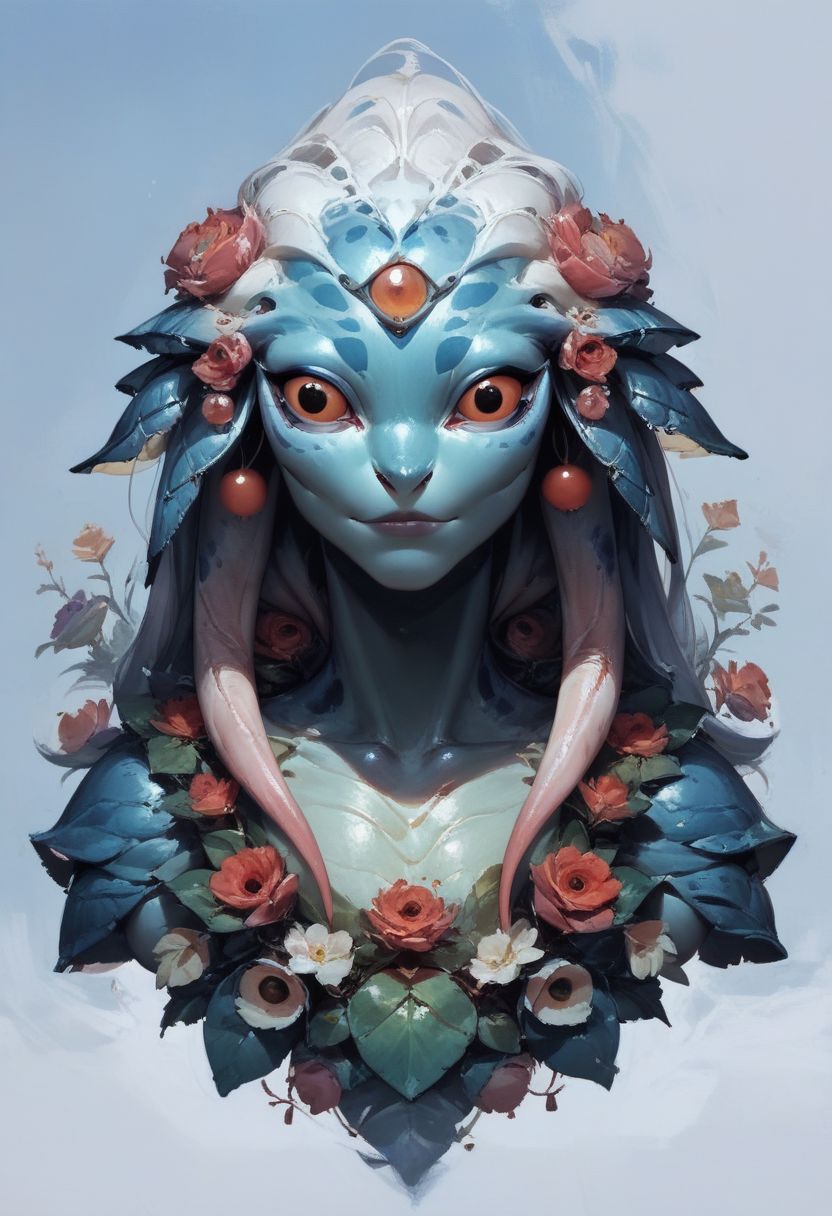 score_9, score_8_up, score_7_up, source_anime, high detail, concept art, traditional media, painterly BREAK anthropomorphic, unusual creature, creature, made of opal, human facial features, cuddlefish and koi fish forms, beautiful alien, graceful